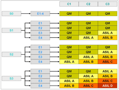 Über einen Risikographen ergibt sich aus allen drei Summanden die „ASIL-Klassifikation“: die Bestimmung der ASIL-Level (Tabelle).